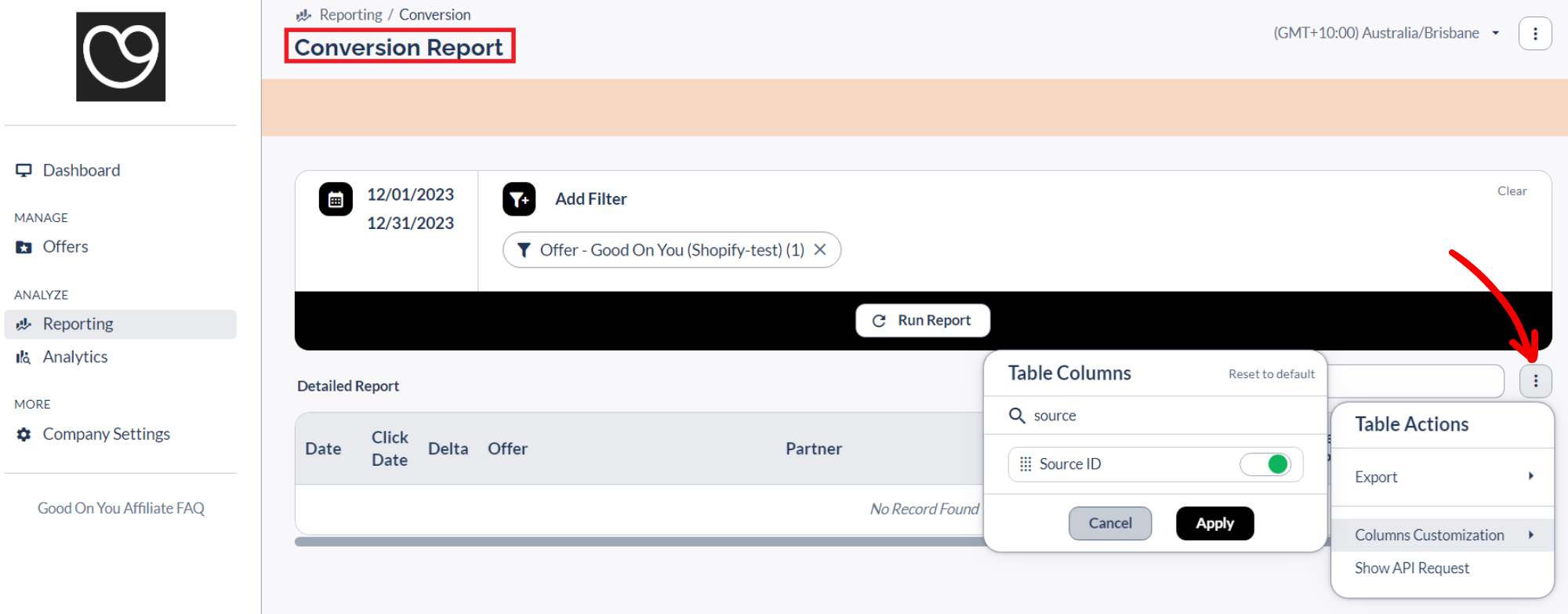 You can add the "Partner", “Source ID” and "Sub 1" fields to your Conversion and Click reports to see if clicks and conversions are coming from your brand page on Good On You’s directory, or a mention in an article, email, social media, app, or from other publishers than Good On You.