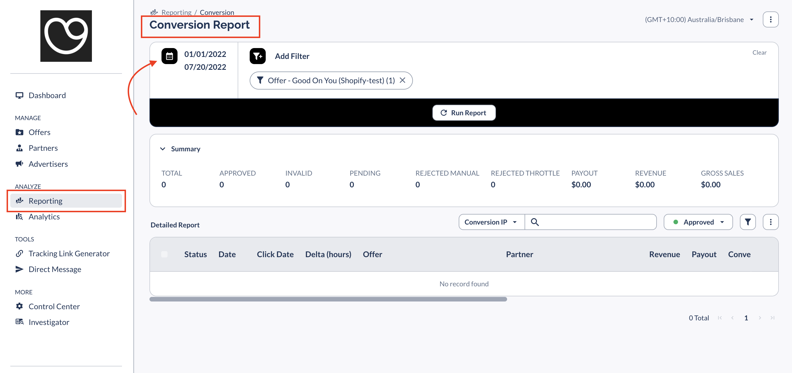 (1) Go to Reporting > Conversion report, and select a time frame.