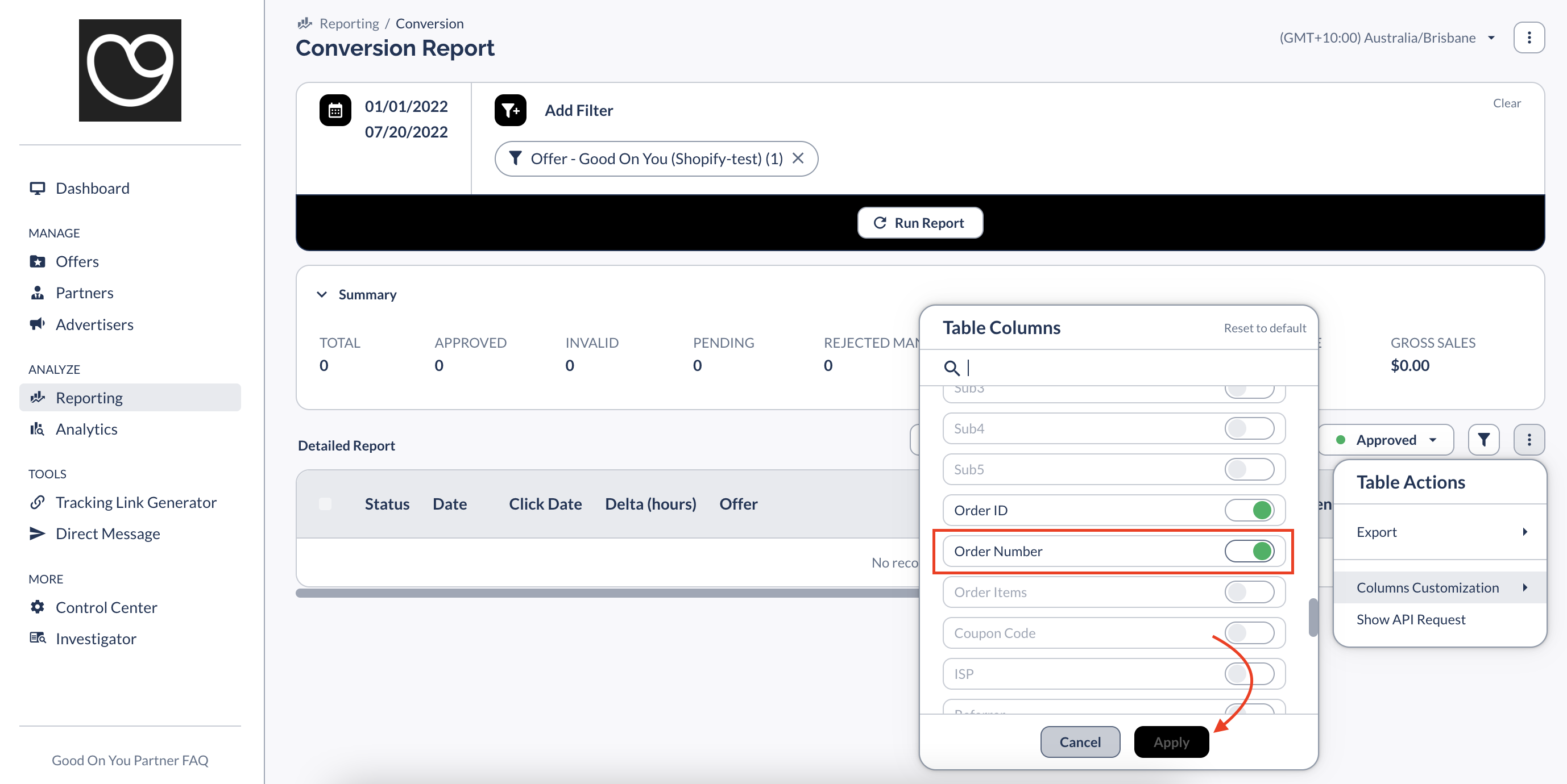 (3) Make sure that 'Order Number' column is selected -- if not, turn it on and then click 'Apply'.